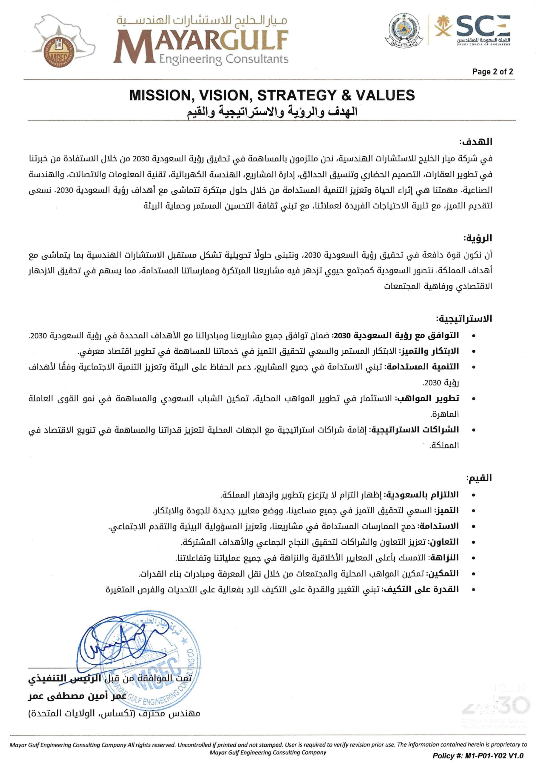 • التنمية المستدامة: تبني الاستدامة في جميع المشاريع، دعم الحفاظ على البيئة وتعزيز التنمية الاجتماعية وفقًا لأهداف رؤية 2030.